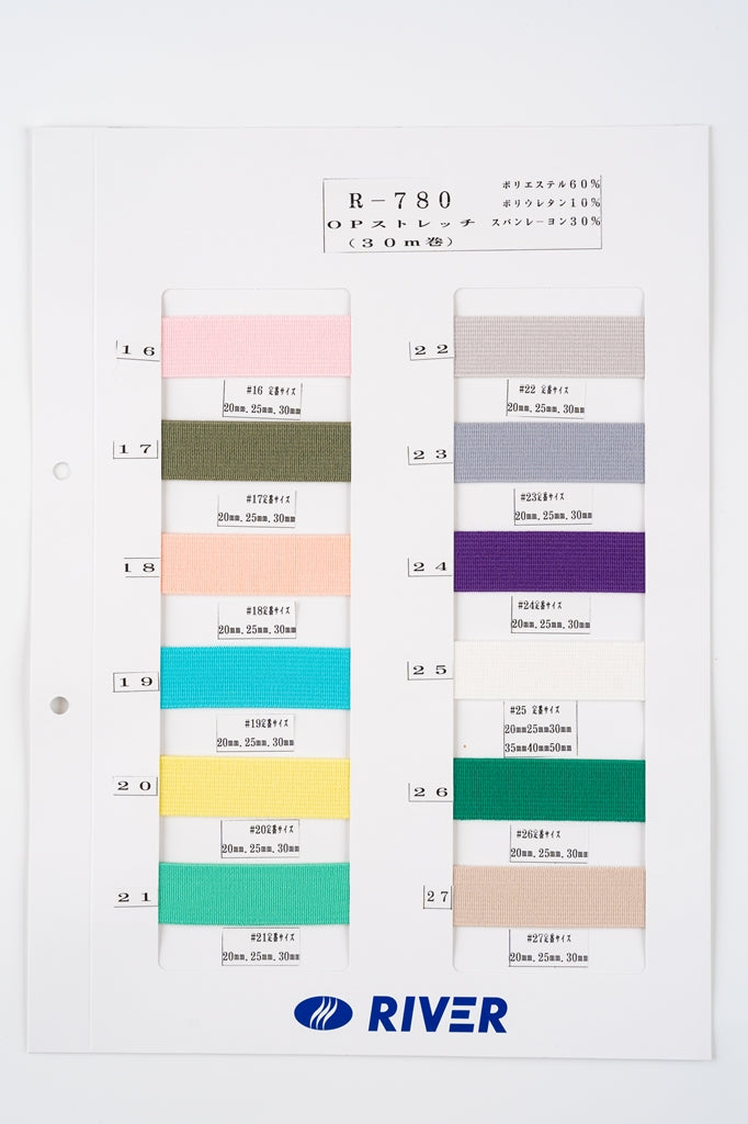【30m巻】OPストレッチ / R-780 厚地平ゴム 硬さ:ミディアムハード(幅20mm) (入園・入学準備に、ズボンや運動着の裾・袖ゴムに)